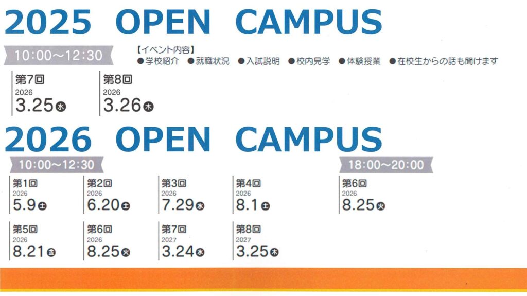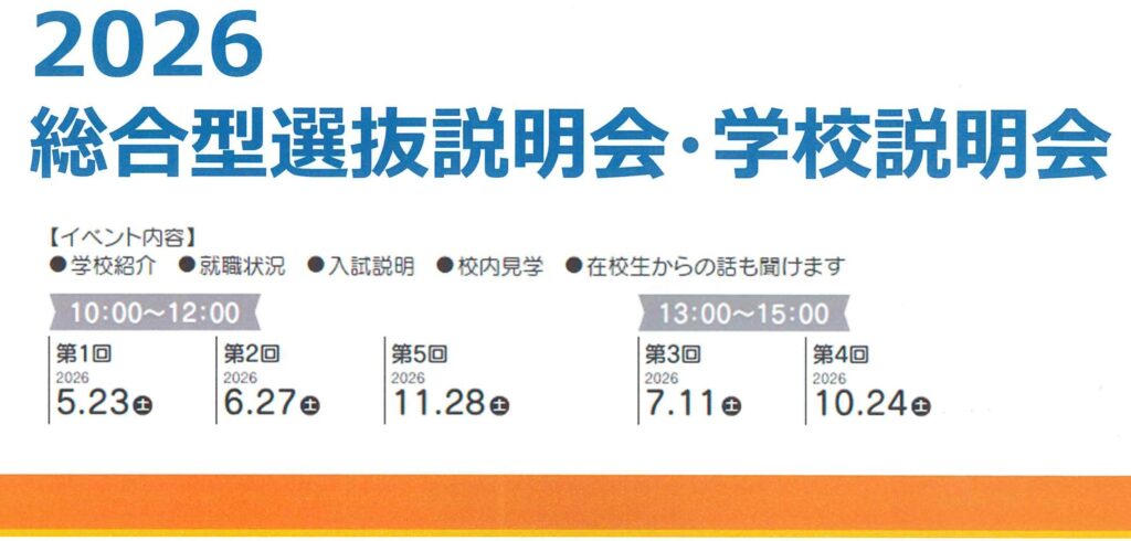 *学校の紹介、入試の説明、就職状況 *在校生からの話 *授業体験 *校内の見学 *総合型選抜(旧AO入試)エントリーシート・課題配布(総合型選抜試験に必要です)