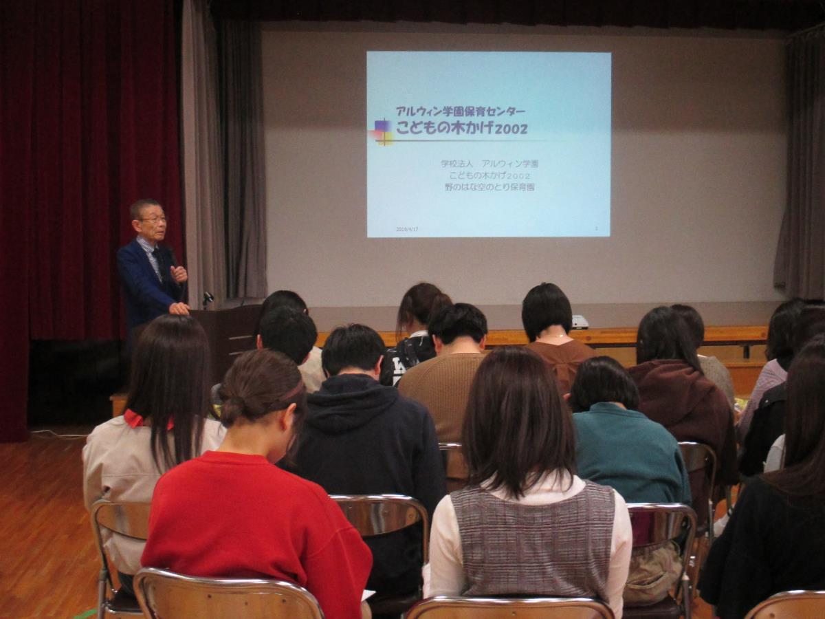 1年生は園庭や学内で保育センターの子どもたちの姿を見たり歓声を聞いたりしていますが、保育の内容や環境について、保育現場の先生方から話を聞くのは初めてということもあり、皆、熱心に耳を傾けていました。