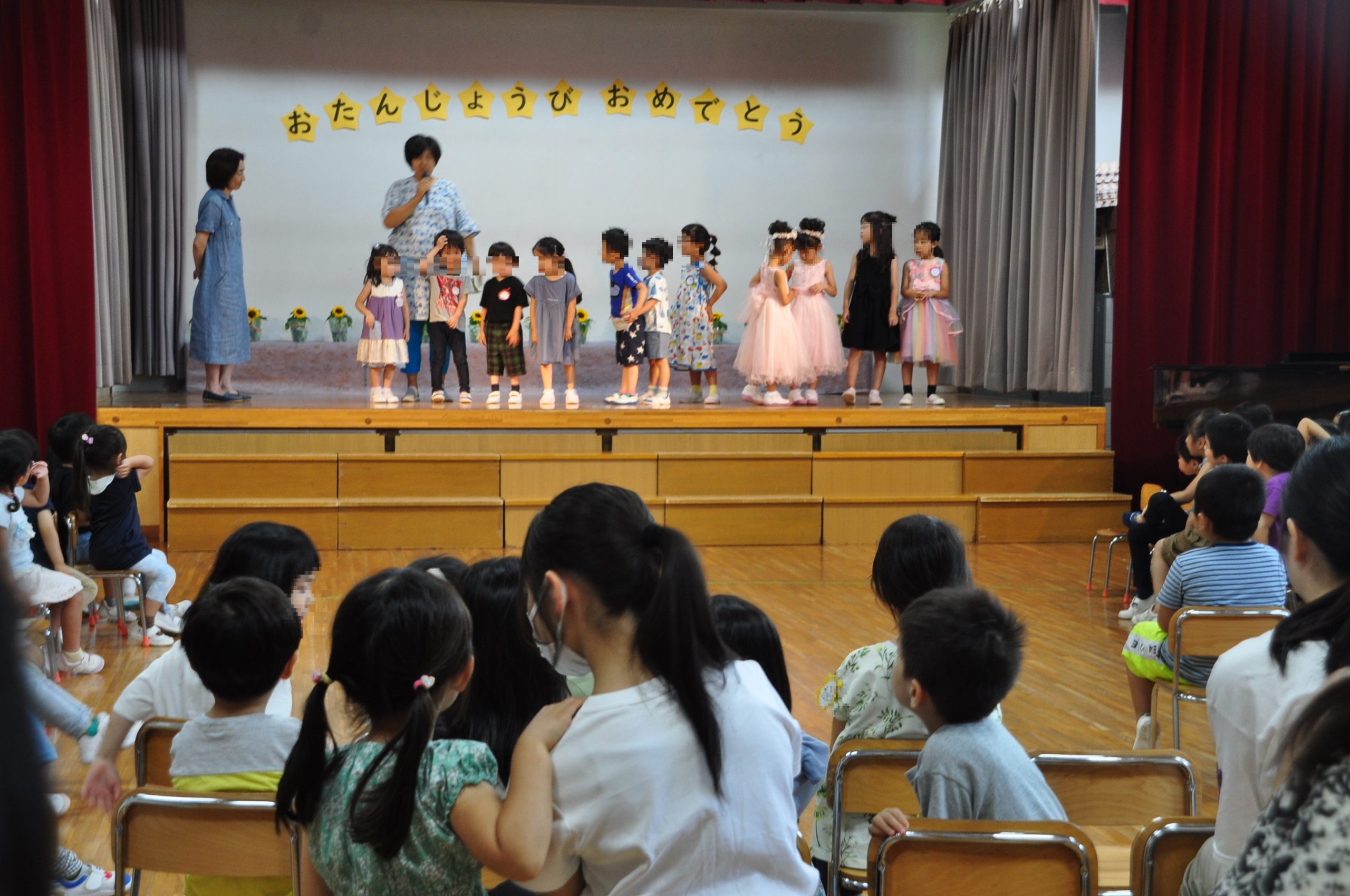 写真は、学生が幼稚園のおたんじょうび会にプラティカルスタディで参加しました。7月生まれのお友だちがステージに上がると、「あのね」と言って、お友達についていっぱい教えてくれました。