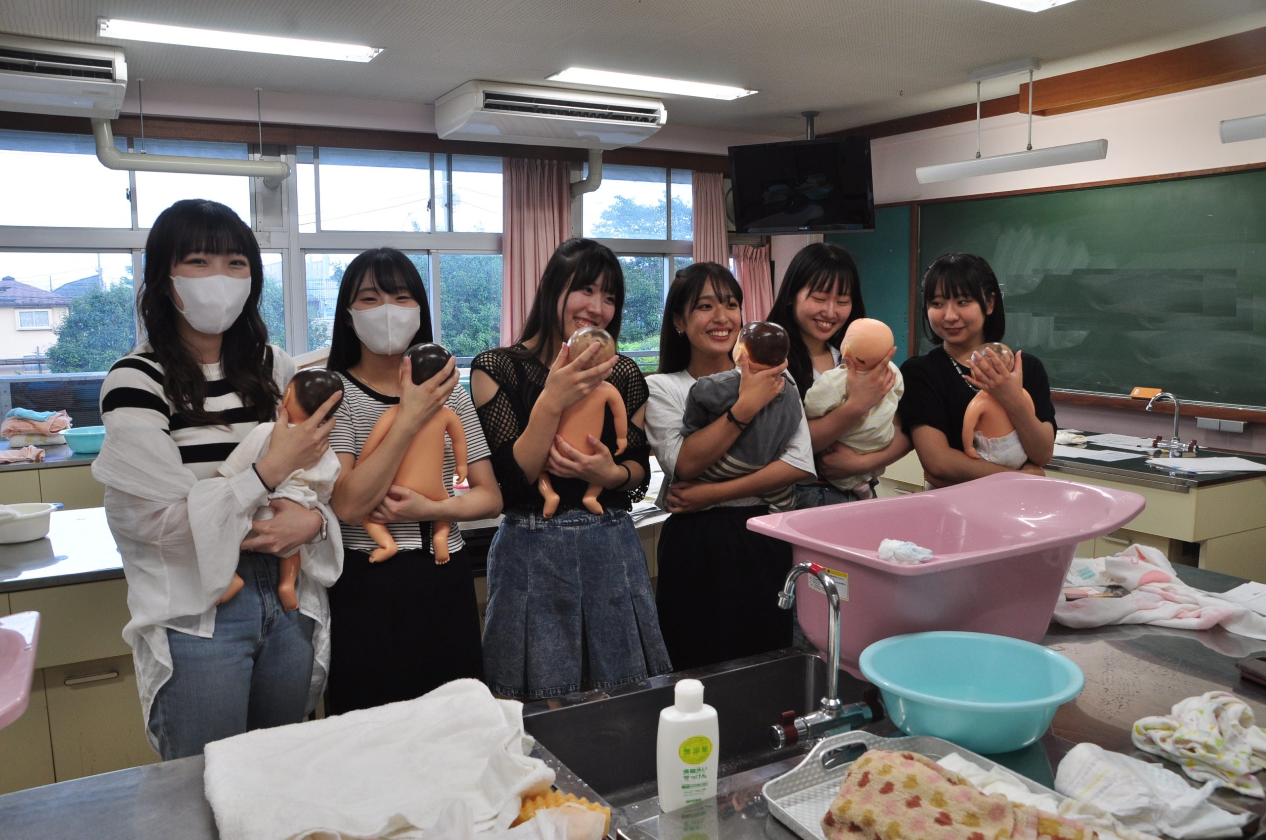 写真は、「子どもの保健」の授業での、沐浴実習の様子です。赤ちゃん人形を抱っこして、みんなで「ニヤニヤ」