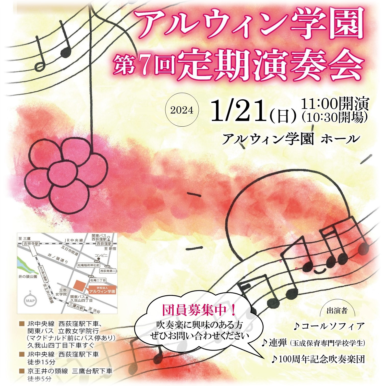 1月21日(日)11:00よりアルウィン学園定期演奏会を開催いたします。是非お越し下さい。お待ちしています。(予約不要)