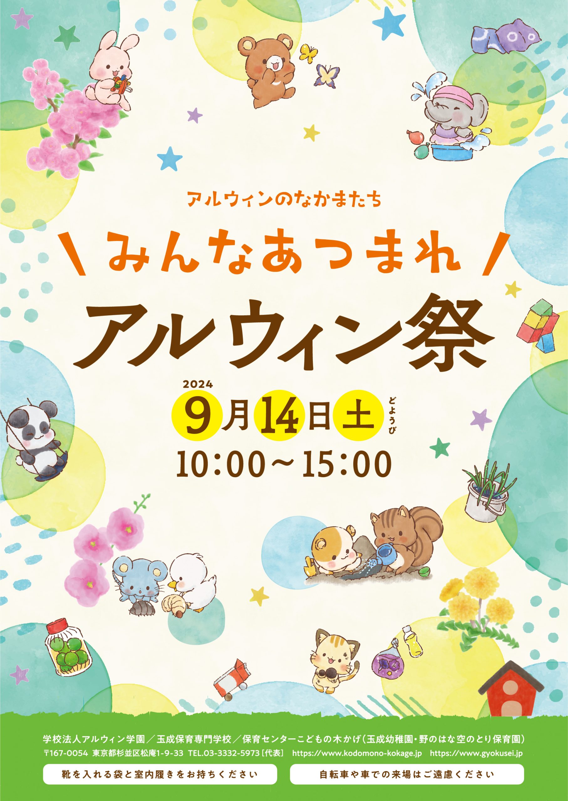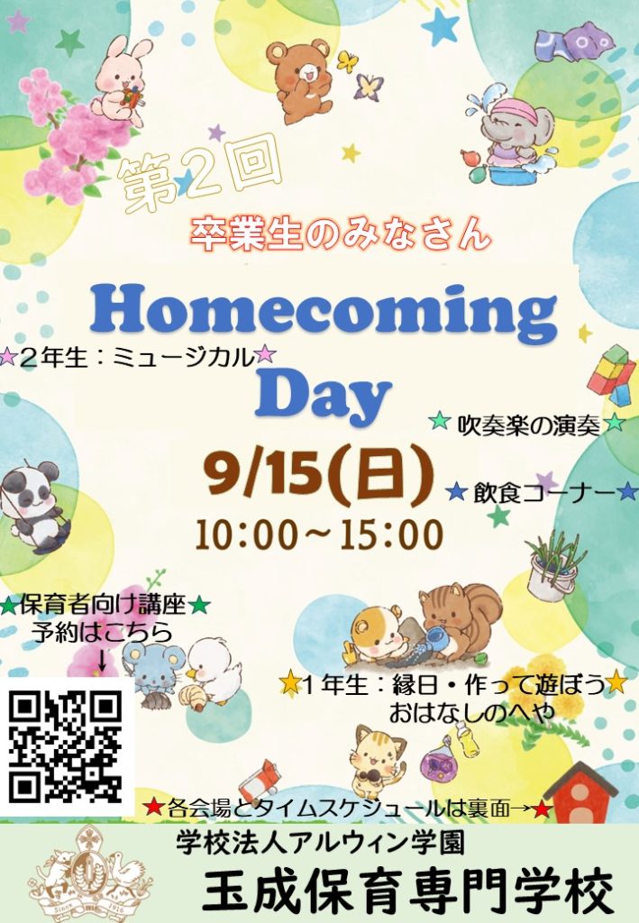 9月14日(土)は、アルウィン学園のアルウィン祭です。9月15日(日)は、卒業生の皆さまに来ていただく、ホームカミングデーです。ぜひお越しください!お待ちしています!靴を入れる袋と、室内履きをお持ちください。