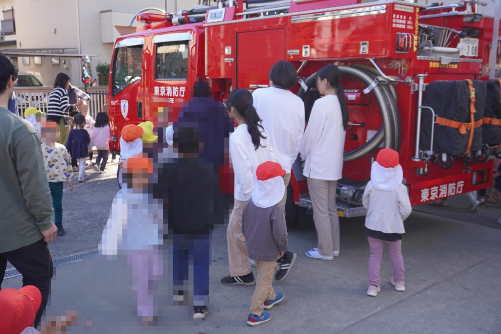 幼稚園・保育園の子どもたちと一緒に「合同防災訓練」を行いました。はしご車も来て、子どもたちの目はキラッキラッ✨✨